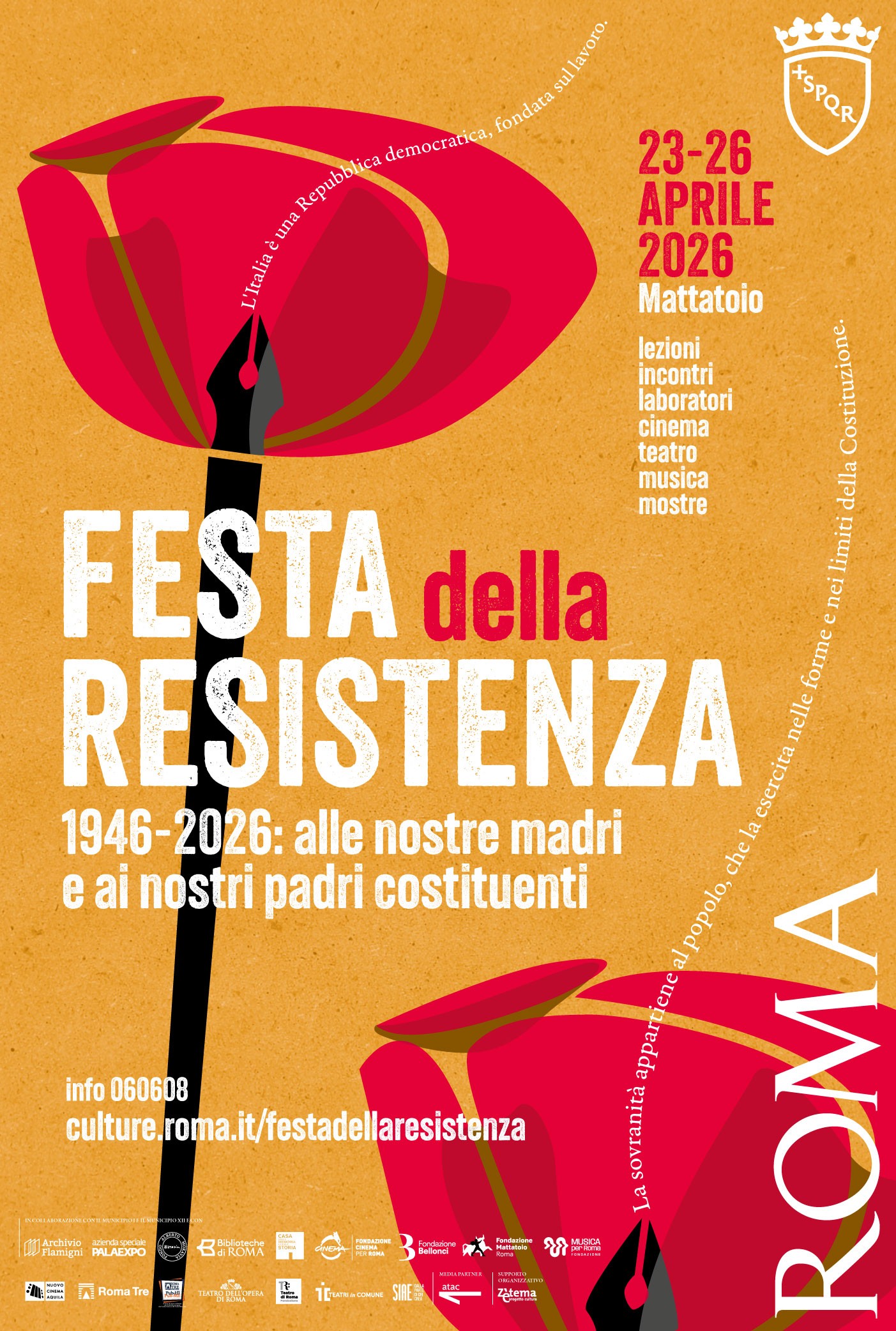La Festa della Resistenza di Roma 2026 è promossa e sostenuta dall’Assessorato alla Cultura e al coordinamento delle iniziative riconducibili alla Giornata della Memoria di Roma Capitale, con il coordinamento del Dipartimento Attività Culturali e in collaborazione con Municipio Roma I e il Municipio Roma XII, con Sovrintendenza Capitolina ai Beni culturali, Istituzione Biblioteche di Roma e con Anfim, Archivio Flamigni, Azienda Speciale Palaexpo, Associazione Fondo Alberto Moravia, Casa della Memoria e della Storia, Fondazione Bellonci, Fondazione Cinema per Roma, Fondazione Mattatoio, Fondazione Musica per Roma, Fondazione Teatro dell'Opera di Roma, Fondazione Teatro di Roma, TIC - Teatri in Comune, Fondazione Una Nessuna Centomila, Nuovo Cinema Aquila, Università Roma Tre, Roma Tre Dipartimento Public History.