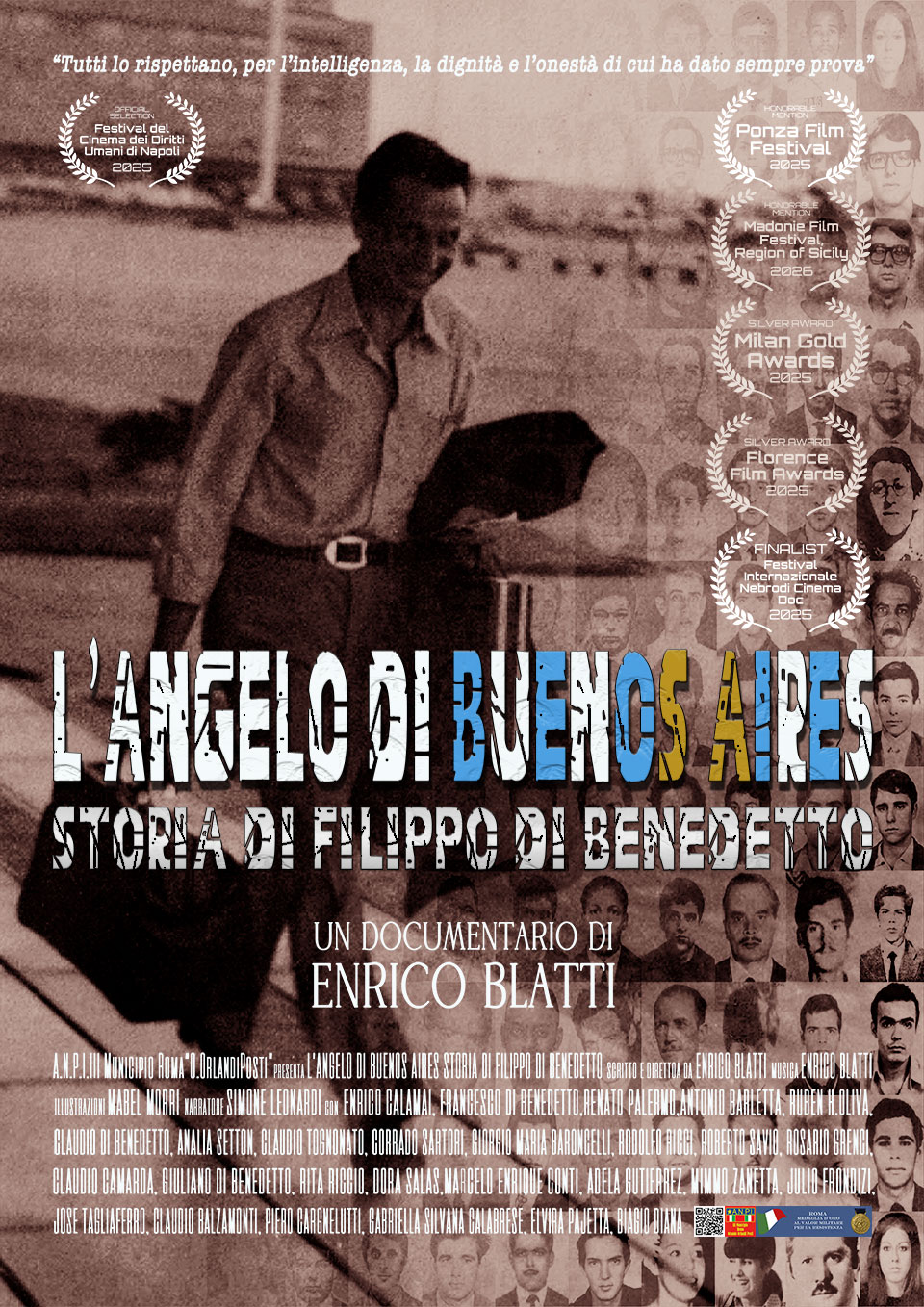 Filippo Di Benedetto fin da ragazzino maturò un forte interesse per la politica e l'impegno civile, assorbendo le passioni del padre, primo abbonato di Saracena (CS) al quotidiano comunista «L'Unità». Organizzatore delle prime lotte sindacali e antifasciste nella zona del Pollino, a soli 21 anni - nel 1943 - fu arrestato, torturato dai fascisti e rinchiuso nel carcere di Castrovillari per un anno. Nel 1952 decise di raggiungere in Argentina il fratello Orlando che già viveva da due anni a Buenos Aires. Dopo il Golpe del 24 marzo 1976 Filippo Di Benedetto, già responsabile del patronato Inca Cgil di Buenos Aires e presidente della Filef, scelse subito da che parte stare: entrato in contatto con l'allora vice console italiano, Enrico Calamai, ed insieme al corrispondente del «Corriere della Sera », Gian Giacomo Foà , ingaggiò una vera e propria missione umanitaria: tutti e tre si misero a servizio delle centinaia di famiglie che disperate si rivolgevano al Consolato d’Italia per trovare accoglienza e rifugio di fronte ai rastrellamenti violenti degli squadroni della morte. Di Benedetto pagò a duro prezzo il suo impegno: la figlia del fratello Orlando, Domenica, fu sequestrata e torturata mentre il nipote Eduardo, sequestrato nel novembre del 1976 da quattro uomini mentre accompagnava i suoi due figli a scuola, a tutt’oggi risulta scomparso. “L’Angelo di Buenos Aires”, attraverso le testimonianze di molti protagonisti dell’epoca che conobbero Di Benedetto, racconta una grande storia di ideali, tenacia e Resistenza.
